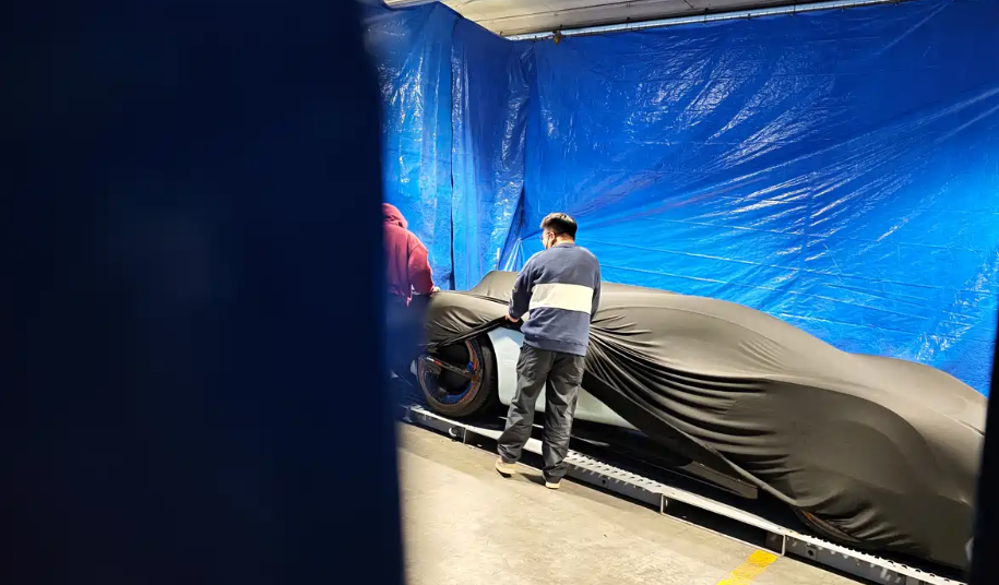 从曝光的细节来看,虽然车身被严密遮盖,但轮圈上的“Xiaomi”字样清晰可见。轮毂采用极具未来感的设计,整体造型低趴流线,中置驾驶舱姿态极低,呈现出纯正赛车的动感轮廓。车背配备巨大扰流板,侧裙采用碳纤维材质,处处彰显空气动力学设计。